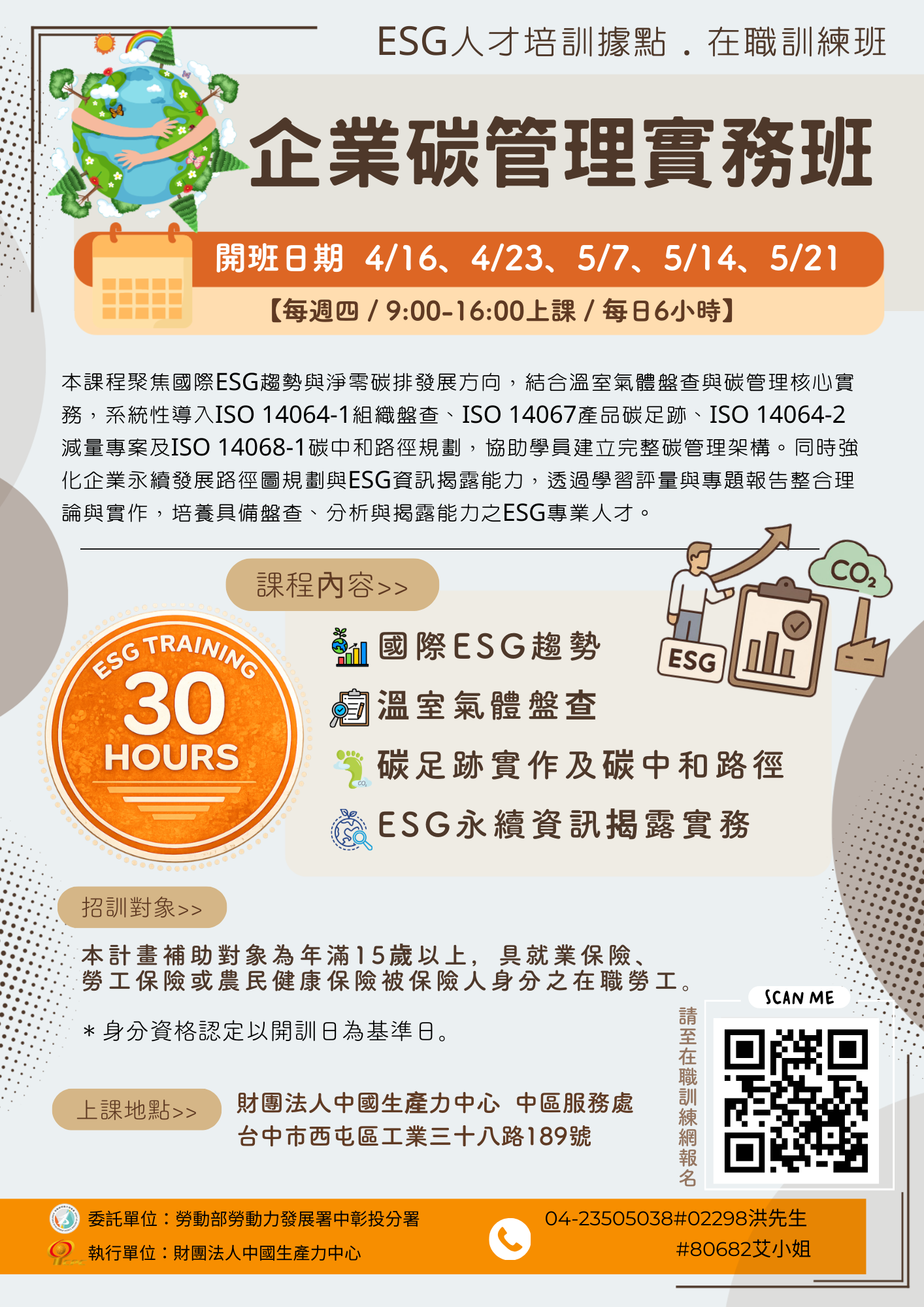 以ISO14064、ISO14067規範為基礎,含括了ESG法規、溫室氣體盤查、產品碳足跡、減碳及碳中和路徑、永續資訊揭露與實際案例分享,令學員可以更快速地了解相關規範、基礎知識與實務。 1.理解ESG理念 (1)了解ISO 14064、ISO14067規範內容。 (2)學習ESG的基本概念及其重要性,讓學員了解ESG的背景和發展趨勢。 (3)了解國內外淨零碳排趨勢、法規與標準,幫助學員理解政策要求。 (4)了解碳盤查、減量到碳中和路徑及基礎知識。 2.技能培養 (1)培養環境影響評估、盤點企業溫室氣體來源。 (2)培養產品碳足跡的計算能力。 (3)培養碳中和路徑規劃能力。 (4)培養企業永續報告揭露能力。 3.實踐應用 (1)通過典型企業的案例分析,幫助學員理解和應用ESG理論。 (2)培訓排放源鑑別及數據收集(溫室氣體),撰寫溫室氣體報告書,完成永續資訊揭露。 (3)運用碳排放計算方法和工具,幫助企業進行碳足跡管理。 (4)依碳盤查與溫室氣體減量,提出碳中和路徑建議。 |